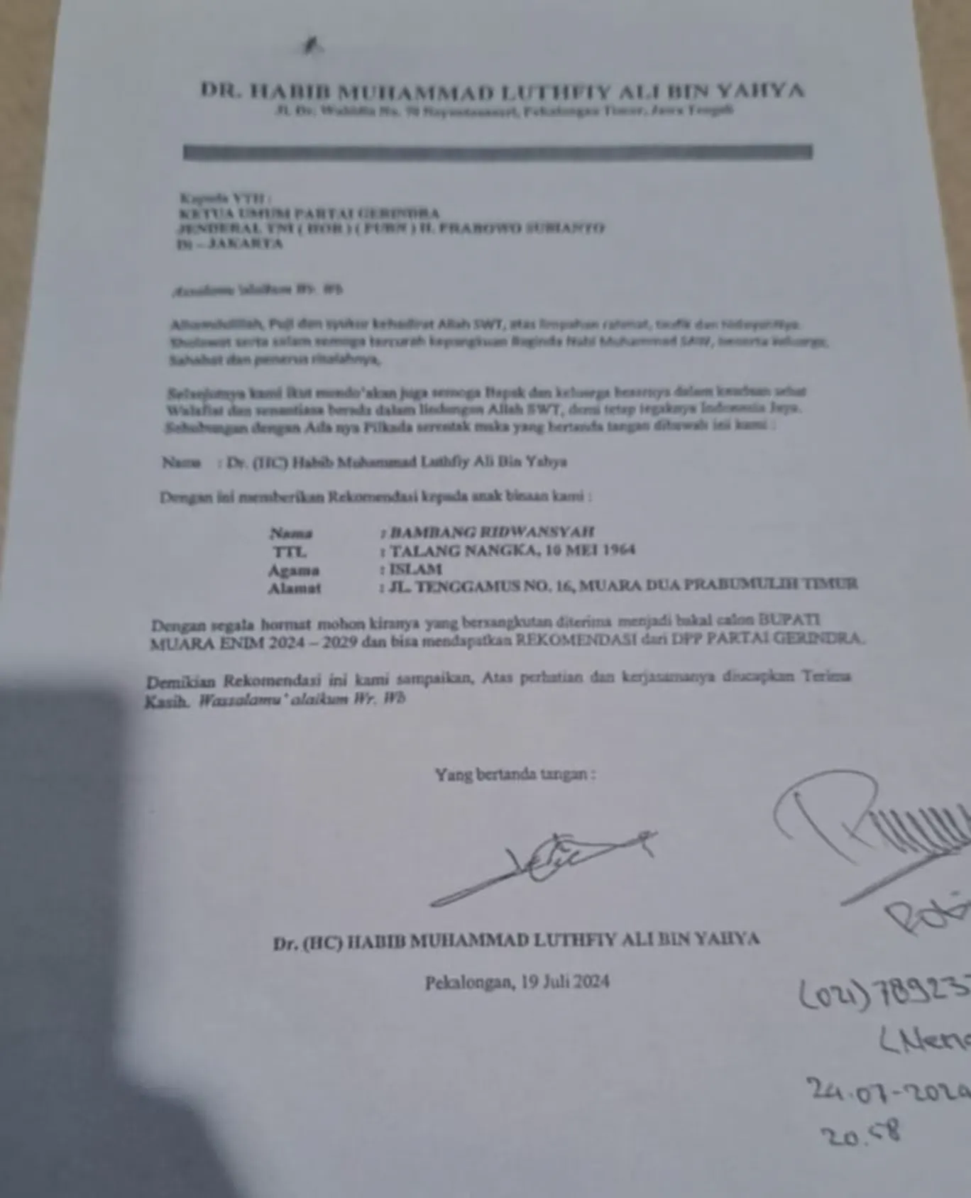 Hingga berita ini ditayangkan DPP Partai Gerindra dan Dr. (HC) Habib Muhammad Luthfi Ali Bin Yahya belum dapat di konfirmasi. (Tim/Red)