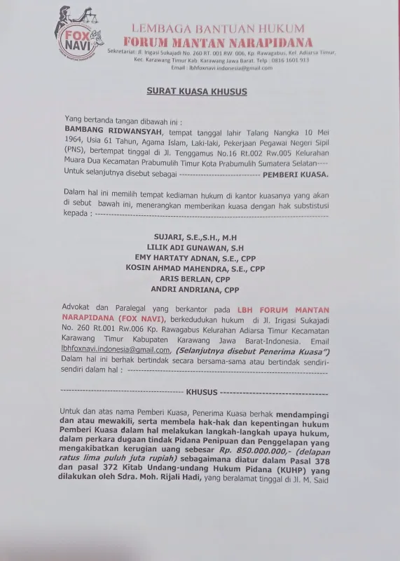 JAKARTA – Lembaga Bantuan Hukum (LBH) FOX NAVI Adv.Sujari,S.E.,S.H.,M.H., telah menerima kuasa dari Bambang Ridwansyah (61) terkait dugaan tindak pidana penipuan dan penggelapan sebagaimana dimaksud dalam Pasal 378 atau 372 KUHP sesuai Laporan Polisi No: LP/B/724/V/2025 /SPKT POLRES METRO JAKSEL /POLDA METRO JAYA pada tanggal 19 Mei 2025 yang menyeret nama oknum Partai Gerindra dan nama besar Ulama Dr. (HC) Habib Muhammad Lutfi Ali Bin Yahya yang ditandatangani pada 14 Oktober 2025.